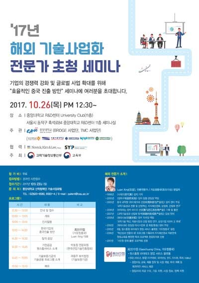 [대학저널 신효송 기자] 중앙대학교(총장 김창수)는 오는 26일 12시 30분 중앙대 서울캠퍼스 102관 11층 세미나실에서 ‘2017년 해외기술 사업화 전문가 초청 세미나’를 개최한다.