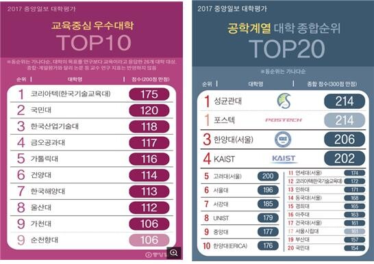 한편 중앙일보 대학평가는 종합평가와 계열평가로 구분해 평가하고 있다. 종합평가는 6개 계열(인문·사회·자연·공학·의학·예체능) 중 4개 이상을 가진 대학 61곳을 대상으로 했다. 계열평가는 인문·사회·자연·공학 등 4개 계열별로 진행했다. 코리아텍은 공학중심대학이라 종합평가대상에서는 제외되고 공학계열평가 대상으로 평가됐다.