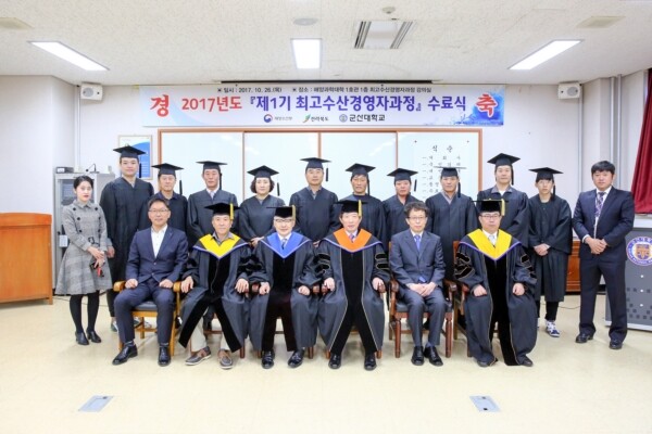 [대학저널 박용우 기자]군산대학교(총장 나의균) 해양과학대학은 26일 군산대학교 해양대학 1호관에서 ‘2017년도 제1기 최고수산경영자과정 수료식’을 개최하고 박광수 등 14명에게 수료증을 수여 했다.