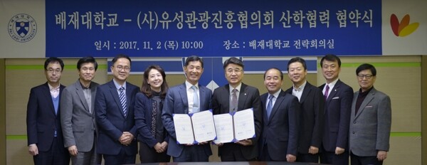 [대학저널 박용우 기자]배재대학교(총장 김영호)와 (사)유성관광진흥협의회는 2일 배재대에서 항공‧관광분야 산학협력 모델 구축 업무협약을 체결했다.