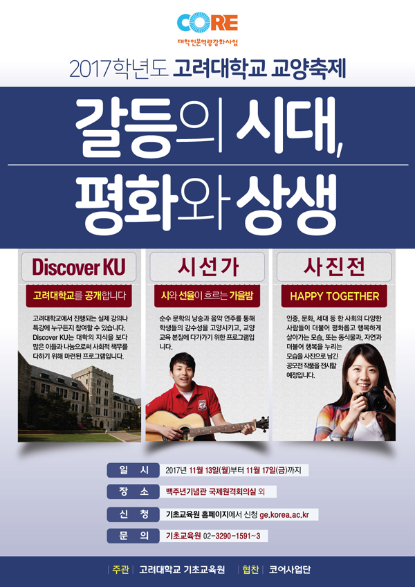 [대학저널 신효송 기자] 고려대학교(총장 염재호) 기초교육원(원장 장동천)이 오는 13일부터 17일까지를 교양축제 주간으로 정하고 'Discover KU'를 개최한다.