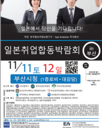 [대학저널 박용우 기자]한국청년국제교류기구(IYO)와 ㈜ East Ambition이 주관하고‘부산광역시,한국산업인력공단,부산국제교류재단’이 주최하는「일본취업합동박람회 in 부산」이 오는 11일-12일 양일동안 부산광역시청 1층 로비와 대강당에서 개최된다.