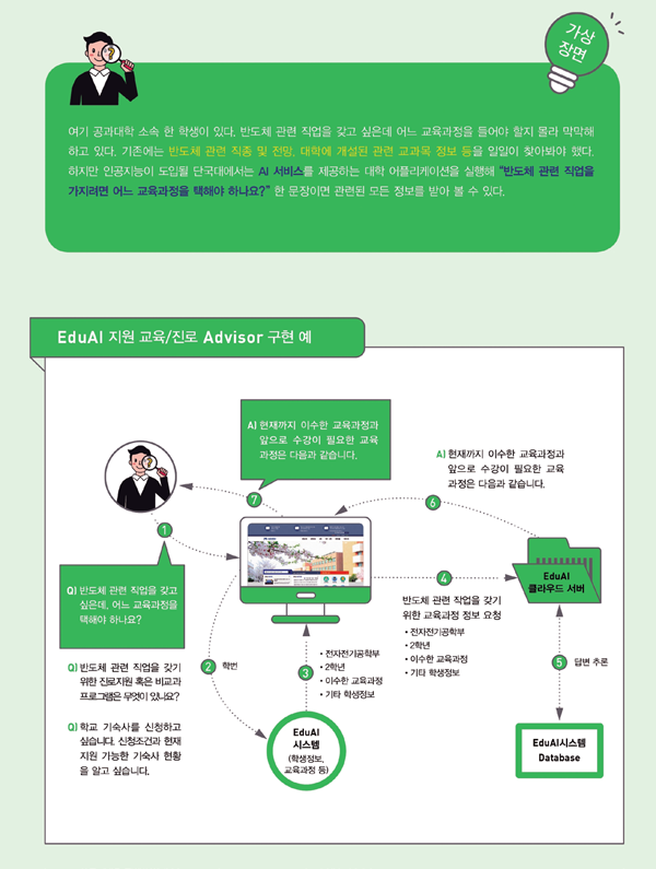 EduAI를 이용하면 ①365일 24시간 질문-답변 ②원하는 시간·장소에서 다양한 매체를 통한 학사시스템 이용 ③객관적인 최신 정보 습득 ④학생 개인 상황·적성에 따른 맞춤 상담 ⑤기존 상담자 역할을 한 교수·직원의 업무 능력 향상 등이 가능해진다.