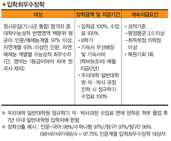 총 856명을 선발하는 정시모집은 가군 33개, 나군 20개 모집단위에서 신입생을 뽑는다. 기존 수능 100%에서 수험생의 학교생활충실도를 반영하고 고교교육정상화를 위해 학생부(교과, 봉사, 출결)를 10% 반영한다. 영어 등급 간 점수를 조정하는 등 수능 반영방법도 변경됐다.”
