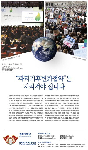김혜영 입학관리처장 겸 대외협력실장은 “기후 변화는 인류에 매우 심각한 결과를 초래할 수 있는 사안이다. 지성과 대학이 함께 나서야하는 문제인 만큼, 이번 광고는 이러한 문제를 사회적으로 환기시키기 위해 진행했다”며 “앞으로도 경희의 가치·철학을 근간으로 대학의 사회적 책무를 다하기 위해 노력할 것”이라고 말했다.