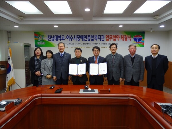 전남대학교와 여수시장애인종합복지관은 29일 오후 전남대학교 여수캠퍼스 대학본부 3층 소회의실에서 이식 부총장, 천중근 관장, 전창곤 여수시의원 등 관계자가 참석한 가운데 여수 지역 장애인 인권과 복지 향상 지원을 위한 업무협약(MOU)을 체결했다.