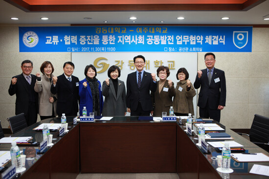 여주대와 강동대학교(총장 류정윤)는 지난 11월 30일 강동대 공산관 소회의실에서 협약을 체결했다. 이날 협약식에는 윤준호 여주대 총장, 류정윤 강동대 총장을 비롯한 양 대학 관계자들이 참석했다.