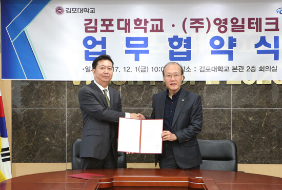 [대학저널 유제민 기자] 김포대학교(총장 황선웅)는 지난 1일 (주)영일테크와 김포대 본관 회의실에서 업무협약을 체결했다. 이번 협약은 전기차 운전자·관련종사자들의 안전교육과 전문 정비인력 양성을 위해 체결됐다.
