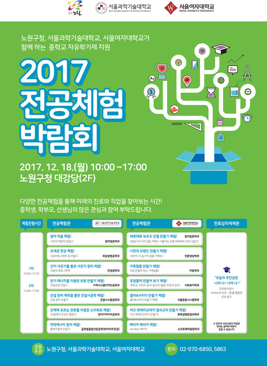 [대학저널 유제민 기자] 노원구청(구청장 김성환), 서울과학기술대학교(총장 김종호, 이하 서울과기대), 서울여자대학교(총장 전혜정)가 함께 미래 직업과 전공을 체험할 수 있는 박람회를 개최해 중학교 자유학기제 지원에 앞장선다.