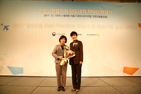 시상식에 앞서 숙명여대는 고용노동부와 진로·취업지원 선도대학 MOU를 체결했다. 이는 지난 9월 고용노동부가 발표한 2017년 진로·취업지원 선도대학에 서울권역 유일한 대학으로 선정된 데 따른 것이다. 업무 협약에 의해 고용노동부와 숙명여대는 전공기반 학년별 진로·취업지원 체계 구축·운영 및 확산을 위해 상호 협력할 예정이다. 학생들의 효과적인 진로 및 경력개발 관리를 위해 온라인 시스템의 연계 및 콘텐츠 활용에도 적극 나서기로 했다.