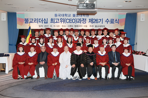수료식은 26기 수료생 50명을 비롯해 총 80여 명이 참석한 가운데 진행됐다. 동국대 이사장 자광 스님은 “동국대 불교리더십 최고위과정은 교계의 지도급 스님들과 불교신앙생활을 하는 기업인, 언론인, 정치인, 법조인 등 다양한 분야의 리더들에게 부처님의 지혜와 불교적 경영 마인드를 키워가도록 운영해나가고 있다”며 “앞으로도 동국대의 발전에 항상 관심을 가져주시길 바란다”고 말했다.