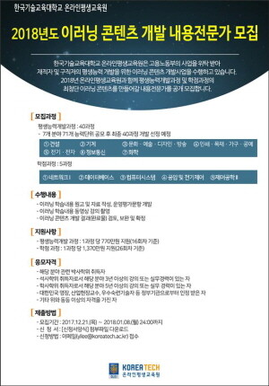 [대학저널 임지연 기자] 코리아텍(한국기술교육대학교, 총장 김기영) 기술 및 공학 이러닝(e-learning) 전문교육기관인 온라인평생교육원(원장 권오영)이 2018년 이러닝 콘텐츠 개발을 위한 내용전문가(집필가)를 오는 2018년 1월 8일까지 모집한다.