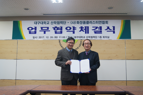 [대학저널 신효송 기자] 대구대학교(총장 홍덕률) 산학협력단(단장 윤재웅)이 26일 대구대 산학협력단 1층 회의실에서 (사)화장품클러스터연합회와 업무 협약을 체결했다.