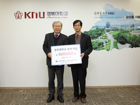[대학저널 유제민 기자] 경북대학교(총장 김상동) 고분자공학과 강인규 교수가 지난 27일 김상동 경북대 총장을 방문해 학과 발전을 위해 써달라며 발전기금 1000만 원을 전달했다. 전달된 발전기금은 '고분자공학과기금'으로 적립돼 경북대 고분자공학과 발전을 위해 사용될 예정이다.