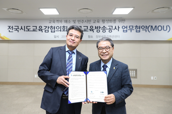 [대학저널 신효송 기자] 전국 시도교육감협의회(회장 이재정 경기도교육감)와 EBS(한국교육방송공사, 사장 장해랑)가 11일 정부세종컨벤션센터에서 교육 혁신을 위한 교육사업 등 공익사업의 공동추진을 위한 업무협약을 체결했다.