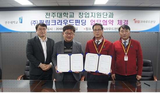 [대학저널 임승미 기자] 전주대학교(총장 이호인) 창업선도대학이 19일 호남지역 최초 후원형 크라우드펀딩(Crowdfunding) 서비스를 제공하는 (주)필립크라우드펀딩과 창업기업의 투자유치 및 마케팅 경쟁력 강화를 위한 업무협약을 체결했다.
