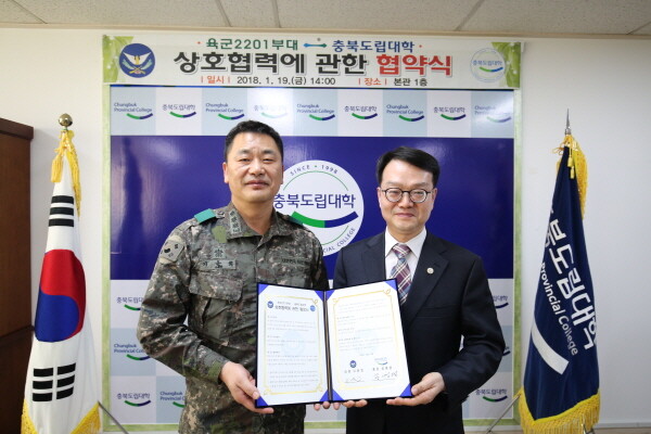[대학저널 임지연 기자] 충북도립대학(총장 공병영)과 육군 제37사단 화랑연대(연대장 이윤희)가 19일 충북도립대학 총장실에서 업무협약을 체결했다.