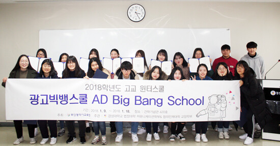 [대학저널 유제민 기자] 경성대학교(총장 송수건)는 지난 18일 경성대 건학기념관 420호에서 '2018 고교윈터스쿨:광고빅뱅스쿨(AD Big Bang School)' 수료식을 개최했다.