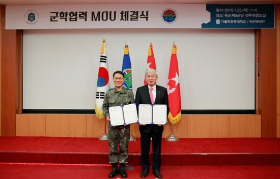 가톨릭관동대는 25일 육군 제8군단 사령부에서 육군 제8군단과 군학협력 업무협약식(MOU)을 맺었다. 이번 협약은 강원지역 군부대와의 인성교육 및 취·창업교육 지원과 재능기부확대 등을 주요 내용으로 한다.