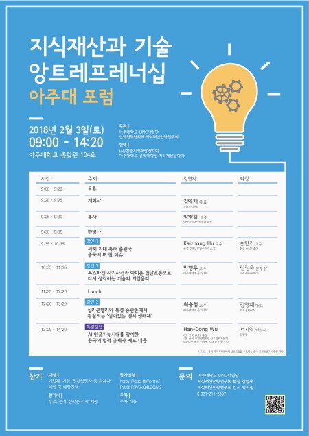 자세한 문의는 아주대 LINC사업단(031-219-1903)이나 산학협력협의체 지식재산연구회(031-211-2307)로 하면 된다.
