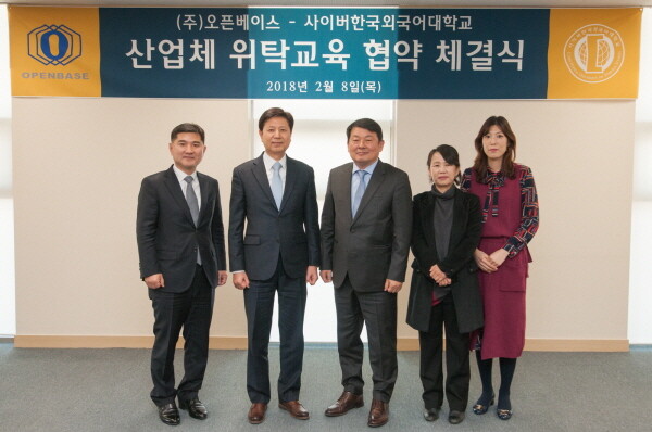 이날 협약식에는 사이버한국외대 김중렬 총장, 윤호숙 입학학생처장, 최서연 온라인교육지원처장과 ㈜오픈베이스 송규헌 대표, 이태경 상무 등 주요 관계자들이 참석했다.