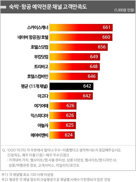 100명 이상의 표본이 확보된 숙박·항공 예약전문 채널은 야놀자, 호텔스닷컴 등 11개였다. 이 중 1위는 661점(1000점 만점)을 얻은 스카이스캐너가 차지했다. 네이버 항공권/호텔(660점)은 1점 차이로 2위에 그쳤으며 뒤를 이어 호텔스닷컴 656점, 부킹닷컴 649점, 트리바고 648점, 호텔스컴바인 646점 등의 순으로 나타났다.