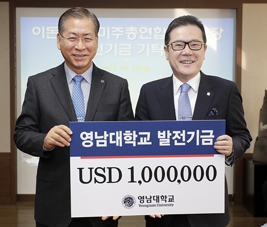 [대학저널 유제민 기자] LA에서 대형 의류업체인 Active U.S.A. Inc.를 경영하고 있는 이돈 회장이 12일 모교 영남대학교(총장 서길수)를 방문해 100만 달러를 기탁했다. 이 회장은 지난 2012년에도 100만 달러를 '월산장학회'에 기탁한 바 있다. 이번 기탁으로 이 회장은 총 200만 달러를 기탁하게 됐다.