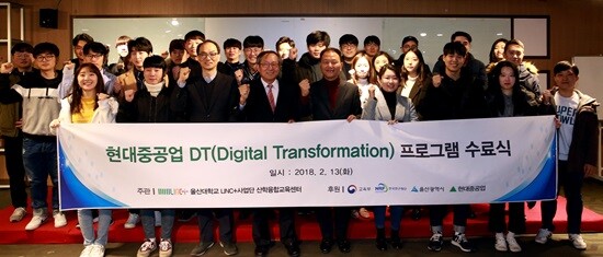 울산대학교(총장 오연천) 사회맞춤형 산학협력선도대학육성사업단이 현대중공업과 함께 시행한 DT(Digital Transformation) 인력양성 교육을 최근 완료했다. 이는 4차 산업혁명 대비 핵심인재를 양성하는 교육과정이다. 이에 13일 울산대 창조경제혁신센터에서 수료식을 가졌다.