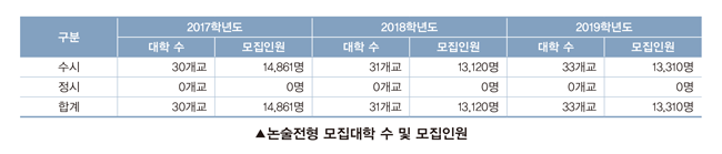 2018학년도에 31개교에서 13,120명을 선발하던 논술전형은 2019학년도에 33개교에서 13,310명을 선발합니다. 논술전형은 성신여자대학교 논술우수자전형(311명)과 한국기술교육대학교 코리아텍일반전형(241명) 신설로 모집인원이 소폭 증가했으며 대학별 평균 모집인원은 2017학년도 495.4명, 2018학년도 423.2명, 2019학년도 403.3명으로 감소하고 있는 것이 주목할 만한 특징입니다.