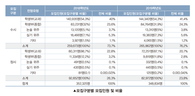 2019학년도 대학입학전형의 전체 모집인원은 348,834명으로 2017학년도 355,745명, 2018학년도 352,325명으로 매년 감소하고 있는 추세입니다. 수시모집은 전체 모집인원(348,834명)의 76.2%인 265,862명, 정시모집은 전체 모집인원의 23.8%인 82,972명을 선발합니다.