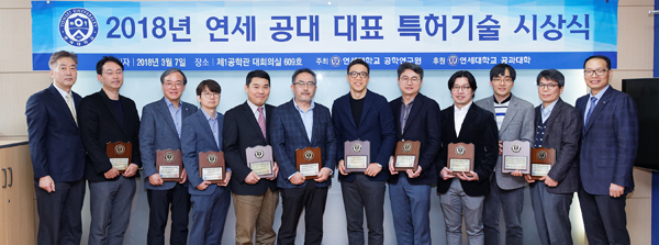 연세대 공과대학(학장 홍대식) 공학연구원은 7일 연세대 제1공학관 대회의실에서 ‘2018년도 연세 공대 10대 특허기술 시상식’을 개최했다.