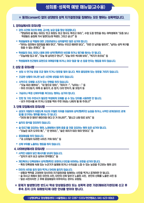 상명대 양성평등센터는 성희롱·성폭력 예방 매뉴얼을 제작, 학교 구성원들에게 배포했다. 성희롱·성폭력 예방 매뉴얼은 학생용, 직원용, 교수용으로 구분된다.