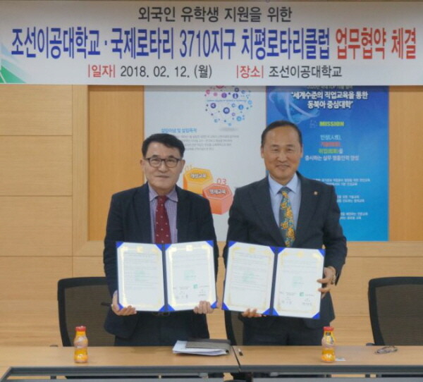 로타리클럽은 인도주의적 봉사 제공, 직업의 높은 도덕적 수준 고취, 전세계 평화 증진 등 사업 및 전문직업의 지도자들로 구성된 세계적인 단체이다. 지난 2월 12일 조선이공대와 국제로타리 3710지구 치평로타리클럽은 외국인 유학생을 위한 교육 활성화를 위해 업무협약을 체결한 바 있다.