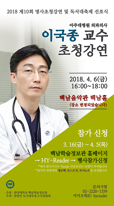 [대학저널 신효송 기자] 한양대학교(총장 이영무) 백남학술정보관(관장 엄익상)이 오는 6일 오후 2시 한양대 서울캠퍼스에서 이국종 아주대병원 교수를 초청, ‘바람과 라이언(The Wind and the Lion)’을 주제로 특별강연을 진행한다.