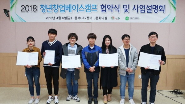 청년창업베이스캠프에 선정된 5개(MIT, 바이러스, I-CAST, 웰니스, 앱터) 창업동아리는 지난 6일 충청북도 C&V센터에서 개최된 협약식 및 사업설명회에 참석해 협약서를 전달받았다. 이들은 앞으로 약 9개월 동안 각각 사업화지원금 400만 원씩 지원받아 상품제작, 정보수집, 시장개척 및 홍보비 등에 활용, 창업역량 강화와 창업아이템 상용화에 역량을 집중할 계획이다.