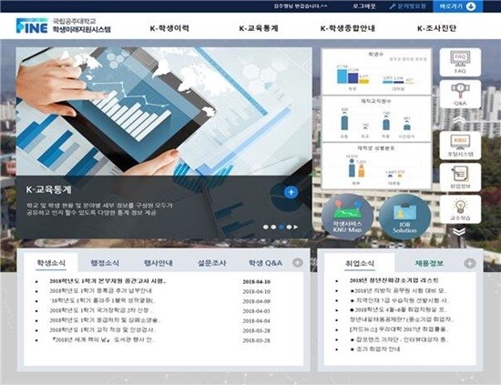 K-학생이력관리는 학생 자신의 성취 현황과 역량을 일괄적으로 파악할 수 있도록 교과 및 비교과 활동에 대한 이력과 분석을 제공할 뿐만 아니라 담임교수 및 업무담당자가 효과적으로 학생에 대한 학사 및 진로지도 상담를 할 수 있도록 했다. K-교육통계는 학교 현황을 손쉽게 파악하고 정보를 활용할 수 있도록 대학 현황 및 학사 현황 정보 등을 수록하여 공주대만의 다양한 통계 차트를 제공한다.