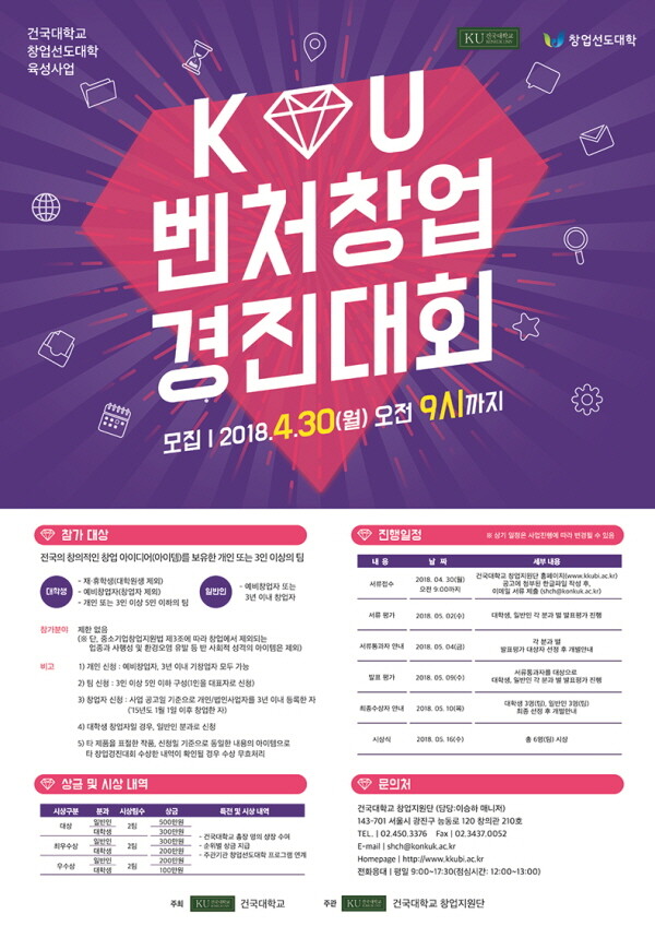 [대학저널 임지연 기자] 건국대학교(총장 민상기) 창업지원단(단장 이철규)이 4차 산업혁명 시대를 주도할 창의적 인력 양성과 창업 활성화를 위해 ‘2018 KU 벤처창업경진대회’를 개최한다.