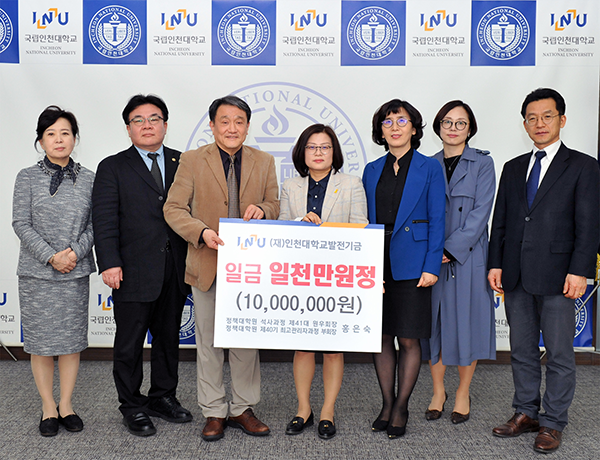 [대학저널 신효송 기자] 인천대학교(총장 조동성)가 지난 16일 인천대 정책대학원 석사과정을 졸업하고 제40기 최고관리자과정에 재학 중인 탑스크린골프존 홍은숙 대표의 대학 발전기금 1000만 원 기탁식을 가졌다.