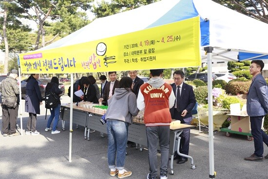 [대학저널 임승미 기자] 군산대학교(총장 곽병선)는 19일 오전 대학본부 앞 광장 일대에서 학생·취업지원처 주관으로 '2018 따뜻한 1000원밥상' 행사를 실시했다. 이번 행사에는 곽병선 총장을 비롯한 주요 보직자 등이 참석했다.