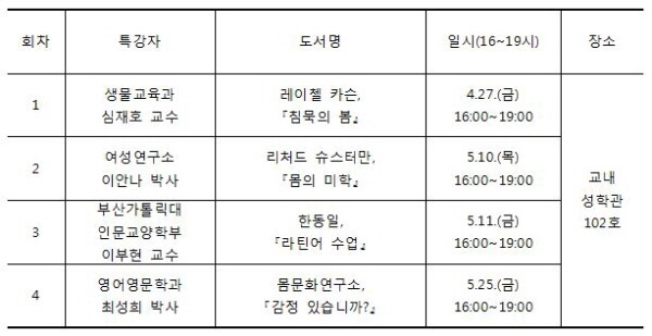 선정 도서는 4월부터 오는 6월까지 3개월간 총 4회에 걸쳐 전문가의 특강과 교수·학생 참가자 토론, 학생 비평문 작성 및 시상 등 다양한 형태의 독서경험으로 독자와 만날 예정이다.