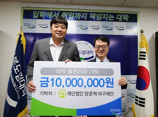 [대학저널 임승미 기자] 양준혁 이사장을 비롯한 재단법인 양준혁 야구재단 관계자들은 지난 23일 충북도립대학교(총장 공병영)를 방문해 공병영 총장 등 교직원들과 간담회를 갖고 발전기금 1000만 원을 쾌척했다.