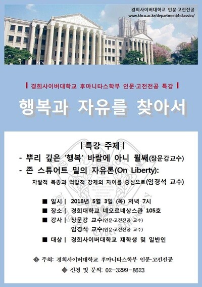 장 교수는 ‘뿌리 깊은 ‘행복’ 바람에 아닐 뮐쌔’를, 임 교수는 ‘존 스튜어트 밀의 자유론(On Liberty): 자발적 복종과 억압적 강제의 차이를 중심으로’라는 주제로 강의를 진행할 예정이다.