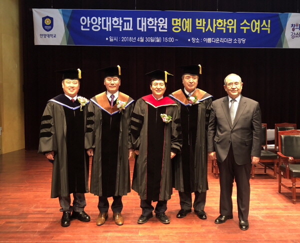 [대학저널 임지연 기자] 안양대학교(총장 유석성)가 개교 70주년을 맞아 지난 4월 30일 안양대 아름다운 리더관 소강당에서 명예박사 학위수여식을 갖고 윤승하 SOM그룹 회장에게 명예 경영학박사, 김원길 바이네르(주) 대표이사에게 명예 철학박사, 김성범 (주)크레용 대표이사에게 명예 경영학박사를 각각 수여했다.