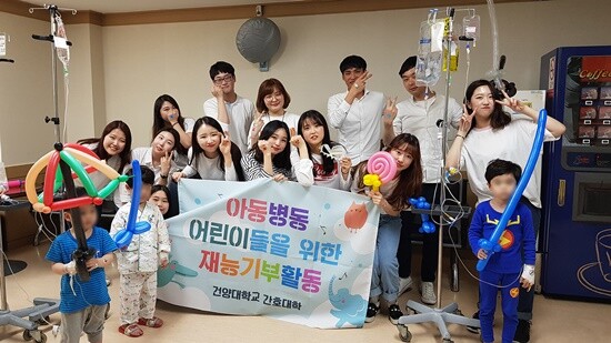 [대학저널 임승미 기자] 건양대학교(총장 정연주) 간호대학 학술동아리 아동간호 연구회(지도교수 오재우)와 아이조아 연구회(지도교수 허보윤) 학생들이 어린이날을 앞두고 지난 3일 오후 3시부터 2시간 동안 건양대병원 소아병동에 위치한 휴게실과 엠블 아동병원 외래 및 병동에서 환아들을 위한 재능기부 활동을 펼쳤다.