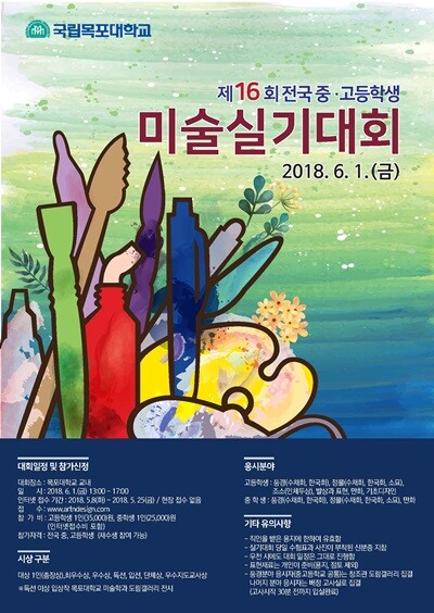 [대학저널 임승미 기자] 목포대학교 미술학과는 오는 6월 1일 목포대 도림캠퍼스 일원에서 전국 중·고등학생을 대상으로 제16회 전국 중·고등학생 미술실기대회를 개최한다.