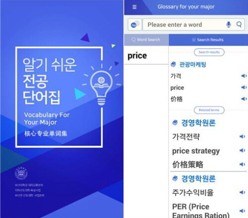 전공 단어집 앱은 구글 플레이 스토어에서 ‘전공단어집’ 또는 ‘PNU Major’를 검색하면 다운로드 받을 수 있다. 한국어·중국어·영어 중 한 가지 언어를 선택해 검색하면 해당 단어의 중국어·한국어·영어 표기가 나오고, 그 단어가 포함된 관련 과목과 함께 연관어 검색도 지원된다.
