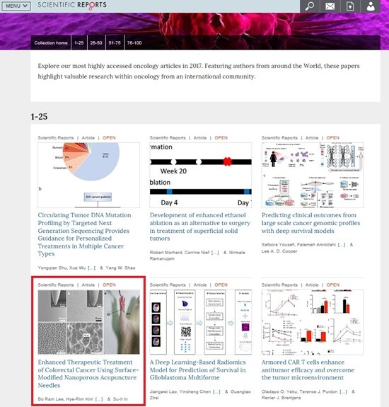 DGIST 에너지공학전공 인수일 교수팀, DGIST 동반진단의료기술융합연구실 김은주 박사팀, 대구한의대학교 한의학과 이봉효 교수팀이 공동으로 연구한 ‘나노다공성 침을 이용한 대장암 치료 가능성 제시(논문명 : Enhanced Therapeutic Treatment of Colorectal Cancer Using Surface-Modified Nanoporous Acupuncture Needles)’ 논문은 지난해 사이언티픽 리포트 종양학 분야에 게재된 논문 2000여 편 가운데 가장 많이 읽은 논문 4번째로 소개됐다.