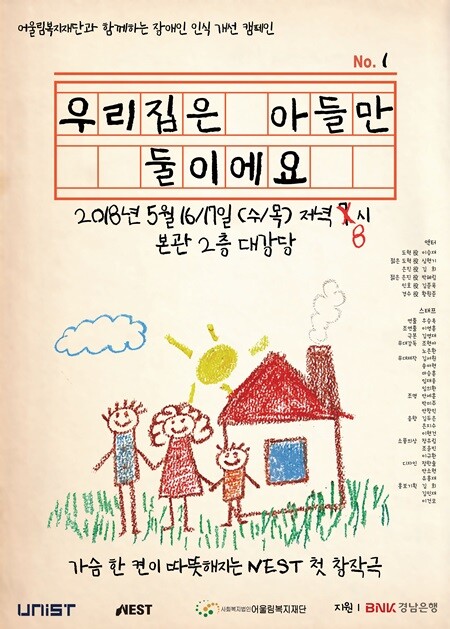 [대학저널 임승미 기자] UNIST(총장 정무영) 연극동아리 네스트(NEST)가 오는 16일과 17일 양 일간 교내에서 장애인 인식개선을 위한 창작극 ‘우리 집은 아들만 둘이에요’ 공연을 진행한다. 오는 23일에는 울산 북구 호계고에서도 공연해 고교생의 장애인 인식개선을 도울 예정이다.