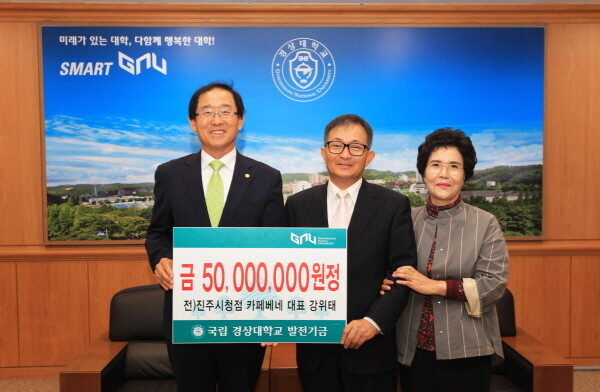 강위태 전 대표는 2012년 4월부터 매년 500만 원에서 1000만 원씩 지속적으로 경상대에 발전기금을 출연해 왔으며, 이번 500만 원 출연으로 7년 만에 5000만 원을 출연하게 됐다.