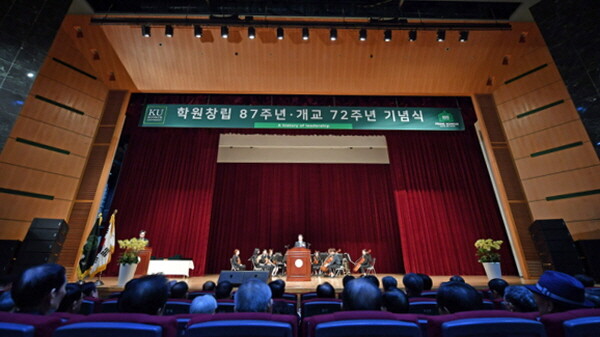 [대학저널 임지연 기자] 건국대학교(총장 민상기) 학원창립 87주년·개교 72주년 축하 기념식이 지난 15일 건국대 새천년관 대공연장에서 열렸다. 기념식에는 건국대 교수와 학생, 동문, 직원, 학교법인 산하기관 임직원, 내외빈 등 1000여 명이 참석해 ‘변화와 혁신’을 통한 새로운 발전을 다짐했다.